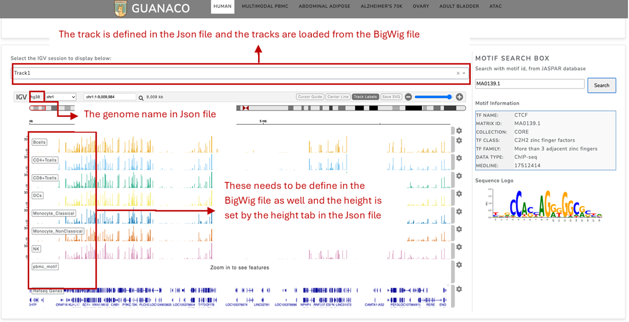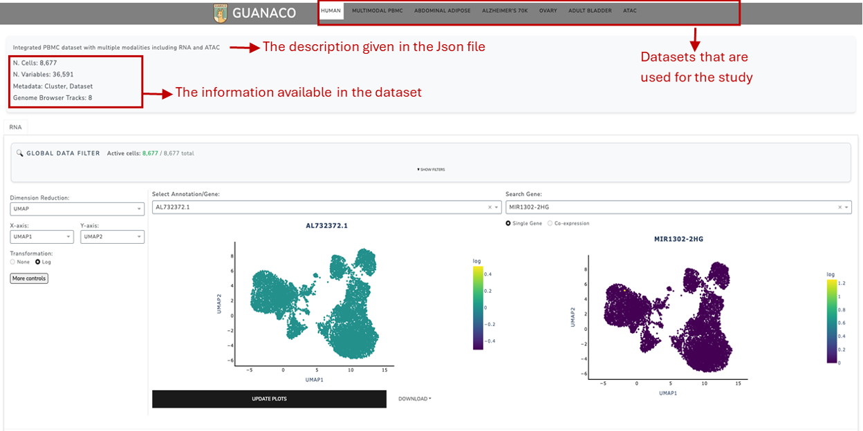 Once the config file is set and the AnnData and BigWig files are prepared, GUANACO can be accessed locally or deployed on a server. The data will be displayed in the designated areas of the platform, as shown in the figures below.